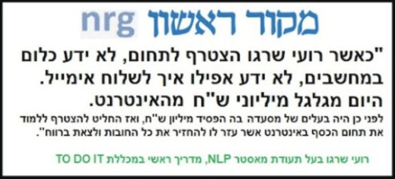 הינני מצהיר כי אני מגיל 18 ומעלה ויש לי ידע בסיסי בגלישה באינטרנט, שימוש בפייסבוק ושליחת מיילים. בהרשמתי בטופס אני מאשר לשלוח לי תכנים פרסומיים