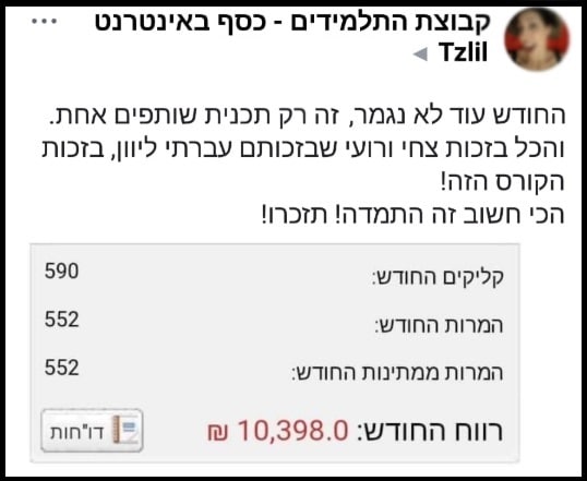 4 מכירות של קורס יוטיוב, (עמלת מכירה 1000 ש”ח) רווח חודשי: 4000 ש”ח